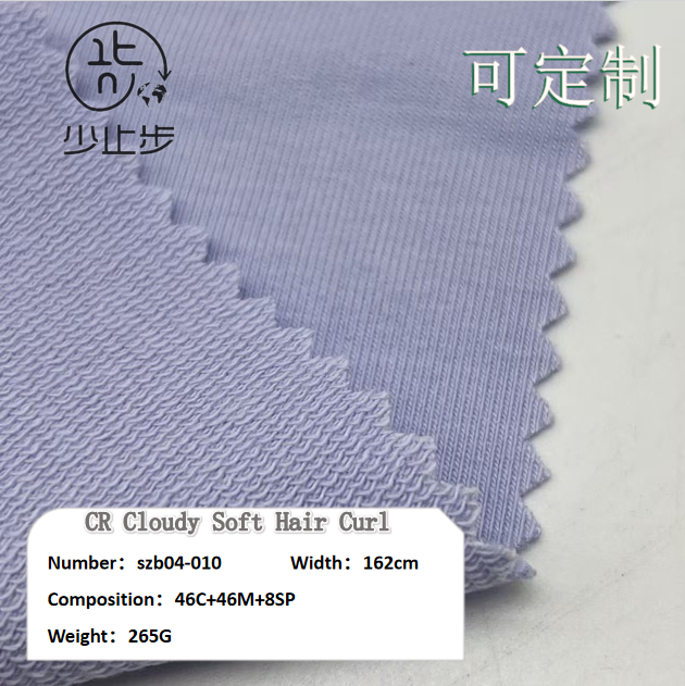 CR云柔小毛圈 面料特点: 纹理质感佳 透气性好,排湿不闷热 耐磨耐穿,不易变形 适用人群: 婴幼儿与妈妈群体 敏感肌人群及舒适度追求者 多场景搭配需求人群 居家·轻度运动爱好者 有亲子装需求的家庭 产品卖点: 云朵般柔软亲肤,适配所有肤质保暖不闷热 可跨多季节穿着高弹性日耐磨 打理轻松便捷肌理精致 轻松搭配各类风格 成衣建议: 休闲工恤、长袖衬衫 休闲夹克 直筒休闲裤 儿童休闲服饰